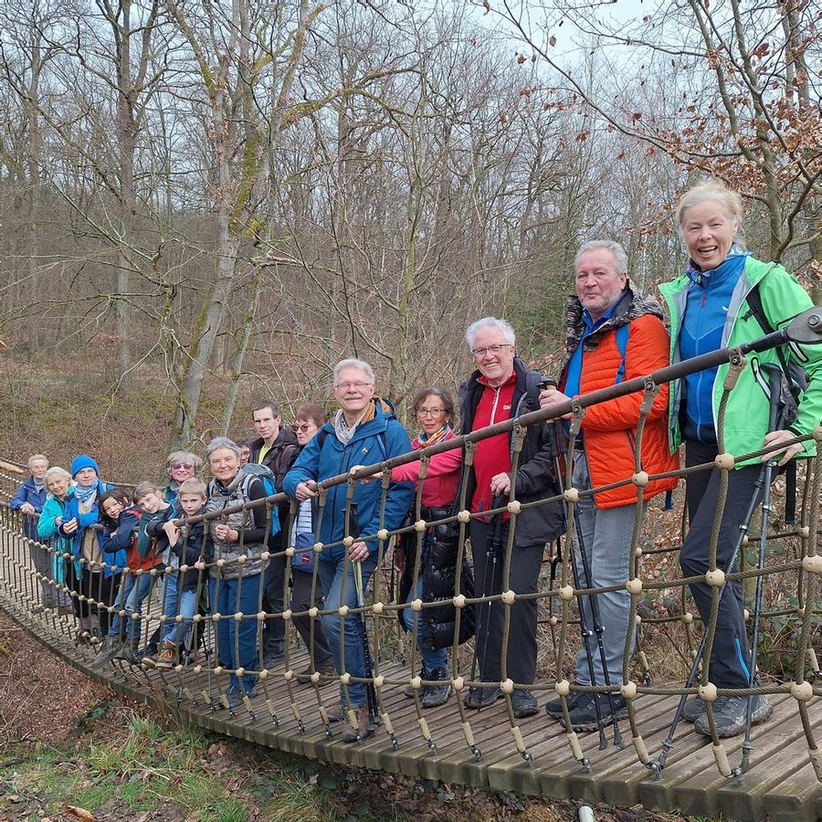 Weiter ging die Wanderung durch den Bingener Wald zum Ende der Kreuzbachklamm und von hier oberhalb des Forsthauses Heiligkreuz weiter über eine Hängebrücke zum Ausflugslokal Schweizer Haus. Ab hier ging es an der Hangkante entlang mit Blick aufs Bingener Loch und Assmannshausen hinab zur Burg Rheinstein. Ab hier wanderte die Gruppe auf einem Pfad Richtung Morgenbachtal und entlang der Burg Reichenstein zum Zielort Trechtingshausen. Alle waren begeistert von der erlebnisreichen Streckenführung mit schönem Blick ins Rheintal.